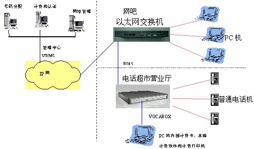 此方案的特點是將電話終端深入到公用電話的超市,用戶可以撥打IP長途電話、PSTN普通電話用戶及移動電話用戶,并在用戶端通過VOCA-BOX語音網(wǎng)關(guān)、計費卡和計費軟件實現(xiàn)本地營業(yè)廳立即計費的要求。在運營商的管理中心通過配置VBMS系統(tǒng)實現(xiàn)后臺集中計費認證功能,用于管理各個營業(yè)中心的VOCA-BOX語音網(wǎng)關(guān),各營業(yè)中心的VOCA-BOX語音網(wǎng)關(guān)提供認證計費信息給VBMS,計費類型可按實際的需求配置如:預付費、后付費等。此方案可以擴大ISP及寬帶網(wǎng)絡(luò)運營商的業(yè)務(wù)市場,增加ISP及寬帶網(wǎng)絡(luò)運營商的收益。