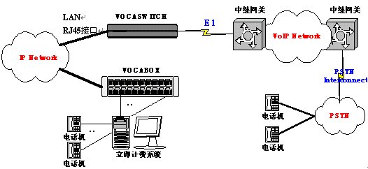 通過在本地IP電話網(wǎng)絡(luò)內(nèi)增加一臺或數(shù)臺網(wǎng)關(guān)(VOCASWITCH)直接連接到VoIP骨干網(wǎng)絡(luò)的網(wǎng)關(guān)的E1端口,實現(xiàn)IP電話呼叫轉(zhuǎn)接。物理連接如圖所示。
