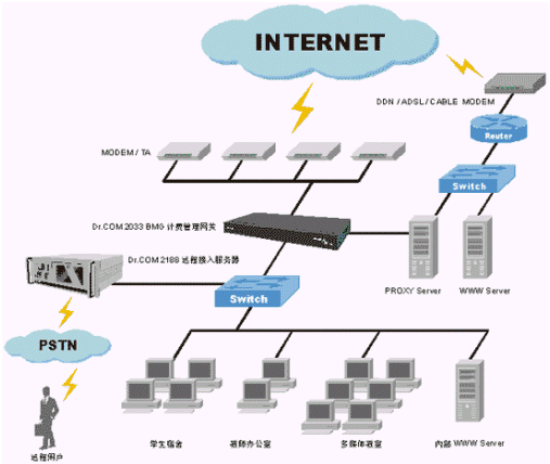 本方案才用Dr.COM 2188遠(yuǎn)程接入服務(wù)器,提供了內(nèi)置的15個(gè)MODEM用作遠(yuǎn)程接入,配套提供專業(yè)開戶、計(jì)費(fèi)、統(tǒng)計(jì)、監(jiān)視和查詢等網(wǎng)絡(luò)版營(yíng)運(yùn)軟件。為校園網(wǎng)未能到達(dá)的地方的用戶(如教師宿舍里的用戶等)提供訪問校園網(wǎng)內(nèi)部資源的途徑,另外也對(duì)學(xué)校開展電子圖書館服務(wù)提供有力的支持,外部的用戶可以通過遠(yuǎn)程接入校園網(wǎng)內(nèi)的電子圖書館的資料,學(xué)校則可以利用2188的計(jì)費(fèi)系統(tǒng)對(duì)此進(jìn)行收費(fèi)。