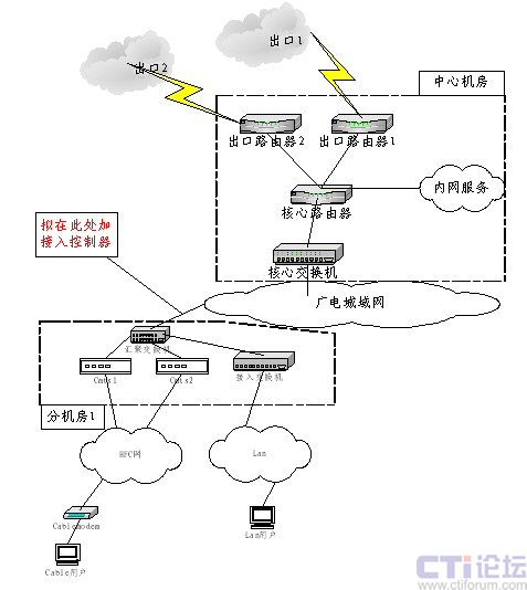 南通廣電目前的IP網(wǎng)絡(luò)拓?fù)淙缦聢D所示,現(xiàn)有電視塔總前端機(jī)房1個(gè);分機(jī)房共有4個(gè),每個(gè)分機(jī)房的情況相同。個(gè)人用戶(hù)以cable modem用戶(hù)為主,用戶(hù)通過(guò)HFC網(wǎng)絡(luò)接入頭端(cmts),再經(jīng)匯聚交換機(jī)接入廣電城域網(wǎng)后經(jīng)電視塔總前端機(jī)房訪問(wèn)internet,新的頭端系統(tǒng)采用Cisco 公司的ubr10012和ubr7246,目前暫決定cable modem和用戶(hù)的PC設(shè)備均通過(guò)DHCP服務(wù)器(Cisco 的CNR軟件)獲得IP地址;Lan用戶(hù)除接入方式不同外,IP地址采用靜態(tài)分配的辦法。目前廣電為部分個(gè)人用戶(hù)分配公網(wǎng)IP地址,其他個(gè)人用戶(hù)分配私網(wǎng)地址由出口防火墻通過(guò)NAT完成地址轉(zhuǎn)換。