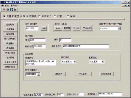客戶打入電話后,當(dāng)系統(tǒng)的自動語音應(yīng)答子系統(tǒng)無法解決客戶問題時(shí),客戶可選擇人工服務(wù),由鐵路客戶服務(wù)代表直接接聽客戶電話,處理并解決客戶問題。此時(shí)客戶同座席話務(wù)人員直接溝通,并同時(shí)記錄下該客戶的聯(lián)系方式,將相關(guān)數(shù)據(jù)添加入系統(tǒng)數(shù)據(jù)庫;也可以在數(shù)據(jù)庫的支持下回答國家和地方的鐵路信息及相關(guān)規(guī)定等的咨詢和疑問?蛻粢部梢赃x擇自動語音服務(wù)方式,根據(jù)系統(tǒng)的語音提示輸入按鍵,選擇類別,將自己的投訴和建議以及自己的聯(lián)系方式信息以留言錄音的方式保存在系統(tǒng)中。系統(tǒng)同時(shí)還支持自動傳真方式,客戶可以通過傳真機(jī)進(jìn)入本系統(tǒng),通過按鍵選擇傳真方式,將自己的意見建議等的文本內(nèi)容傳真給系統(tǒng),系統(tǒng)自動接受并存入數(shù)據(jù)庫。
