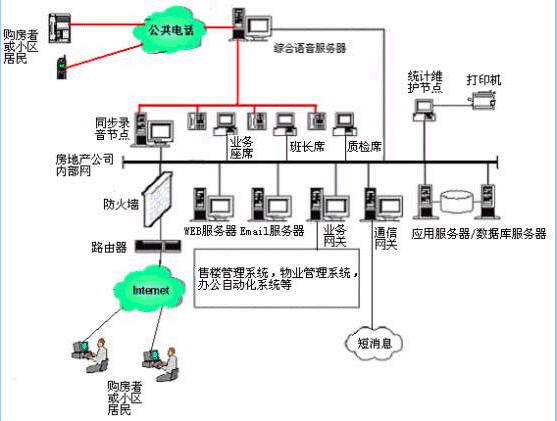 。。用戶利用電話、傳真、WEB、手機短信息、電子郵件等撥打某一特服號碼(如95xxx)進入房地產多媒體客戶服務中心系統(tǒng),本系統(tǒng)依托房地產企業(yè)各類業(yè)務技術支持系統(tǒng),通過人工受理或自動語音服務等方式為各類客戶提供購房和物業(yè)管理服務;形成了對外服務于客戶,對內管理、分析、決策系統(tǒng)相結合的呼叫中心。