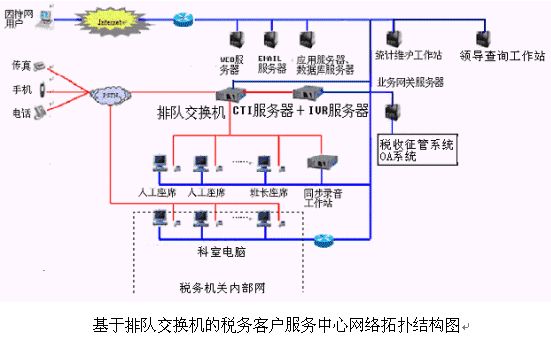 本系統(tǒng)提供基于計算機語音板卡和交換機兩種語音接入方式,都支持1號和7號信令線路的接入。對于20個以下人工座席的中小型稅務(wù)客戶服務(wù)中心系統(tǒng),則建議使用基于計算機語音板卡的方式,可以減少投資,同時具有良好的系統(tǒng)性能;對于大型的稅務(wù)客戶服務(wù)中心系統(tǒng),可選用排隊交換機作為語音接入設(shè)備,以保障系統(tǒng)的高可靠性和穩(wěn)定性。