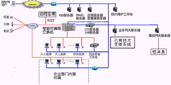客戶利用電話、傳真、手機等撥打統(tǒng)一的特服號碼(如800XXX或9XXXX)或因特網(wǎng)進入農(nóng)業(yè)分布式呼叫中心,本系統(tǒng)依托農(nóng)業(yè)部門各類計算機業(yè)務(wù)技術(shù)支持系統(tǒng)和網(wǎng)絡(luò)系統(tǒng),實現(xiàn)與農(nóng)業(yè)部門原有管理系統(tǒng)/業(yè)務(wù)系統(tǒng)及數(shù)據(jù)庫的無縫連接,通過人工受理或自動語音服務(wù)等方式全天24小時不間斷地為客戶提供各種服務(wù)。