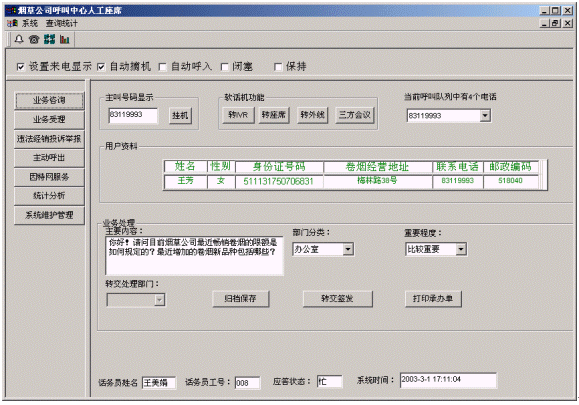 客戶打入電話后,當(dāng)系統(tǒng)的自動語音應(yīng)答子系統(tǒng)無法解決客戶問題時,客戶可選擇人工服務(wù),由客戶服務(wù)代表直接接聽客戶電話,處理并解決客戶問題。此時客戶同座席話務(wù)人員直接溝通,并同時記錄下該客戶的聯(lián)系方式,將相關(guān)數(shù)據(jù)添加入系統(tǒng)數(shù)據(jù)庫;也可以在數(shù)據(jù)庫的支持下處理傳真業(yè)務(wù),電子郵件,計算機文件傳輸、滿意度調(diào)查等。