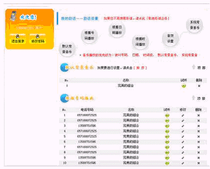 彩話業(yè)務(wù)系統(tǒng)BYBGM2.0功能強(qiáng)大,它允許將被叫分為不同的組或者將其設(shè)置為特殊號(hào)碼,這樣將可以設(shè)置他們的默認(rèn)背景音樂(lè),還可以針對(duì)他們?cè)O(shè)置紀(jì)念日或者按照不同的時(shí)段設(shè)置不同的背景音樂(lè)。當(dāng)用戶喜歡幾首音樂(lè)但又不希望每次都聽(tīng)相同的音樂(lè)時(shí),可以將一定數(shù)目的音樂(lè)設(shè)置為一個(gè)音樂(lè)盒(Music-Box),這樣系統(tǒng)會(huì)每次到音樂(lè)盒中隨機(jī)選取一首音樂(lè)作為彩話背景音樂(lè)。系統(tǒng)中提供的音樂(lè)素材不能滿足用戶的需求時(shí),用戶可以通過(guò)"彩話DIY"服務(wù)自己錄制音樂(lè)素材到系統(tǒng)中或?qū)⒅付ǜ袷降囊魳?lè)素材上傳到系統(tǒng)中,充分展現(xiàn)自己的個(gè)性和創(chuàng)作才華。在通話過(guò)程中,用戶也可以隨心所欲控制彩話,這就是"隨心變奏"服務(wù),通過(guò)它用戶可以在通話過(guò)程中變換彩話背景音樂(lè)或音量的大小,這就使得用戶甚至可以編制一個(gè)通話場(chǎng)景(不同的背景音樂(lè)、不同的音效),并可以根據(jù)被叫的反應(yīng)及時(shí)加以控制,從而得以充分展現(xiàn)自己的通話魅力。