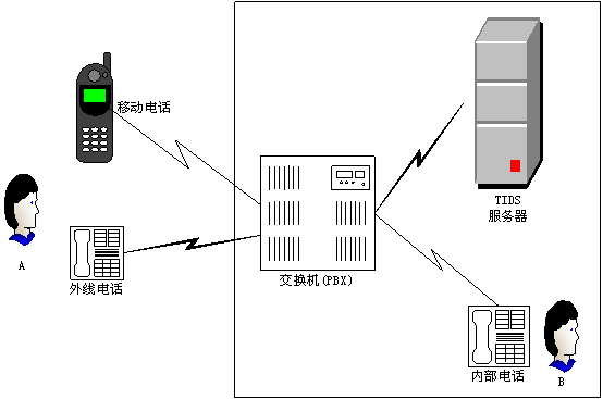 如圖1所示,在一個(gè)典型的應(yīng)用環(huán)境里,TIDS系統(tǒng)可與公司或單位的電話交換機(jī)通過(guò)一條或若干條模擬電話線相連。未來(lái)TIDS的版本將可支持E1/T1數(shù)字中繼線。可以將TIDS設(shè)置為缺省的電腦話務(wù)員,即用戶(hù)呼叫直接由TIDS系統(tǒng)處理;也可以分配一個(gè)分機(jī)號(hào)碼給TIDS,當(dāng)用戶(hù)需要時(shí)可撥該號(hào)碼使用TIDS服務(wù)。在后一種情況下,最好是在交換系統(tǒng)的問(wèn)候語(yǔ)中提示用戶(hù)如何撥打TIDS系統(tǒng)。