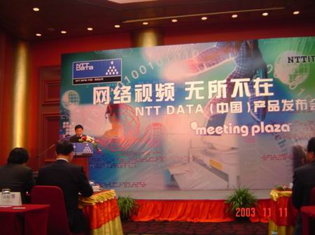 2003年11月11日,NTT DATA(中國)有限公司,在長城飯店舉行了名為“網絡視頻——無所不在”的產品發(fā)布會。會上,NTT DATA(中國)有限公司正式推出了一款網絡視頻軟件產品——“MeetingPlaza”。此產品開拓了視頻系統(tǒng)在圖像效果、控制靈活度以及性價比上的全新應用模式。該產品的開發(fā)商NTT-IT,自2001年6月起在日本開始系統(tǒng)的銷售及提供ASP服務。到現(xiàn)在已經向500家以上的日本企業(yè)及地方政府提供了服務,在日本深受好評。在中國,雖然軟件視頻會議系統(tǒng)還處在起步階段,但依據未來視頻通訊的廣大需求,以及“MeetingPlaza”具有的投入成本低、限制少和適用性強的特點,都將使該產品更加具有市場潛力。
