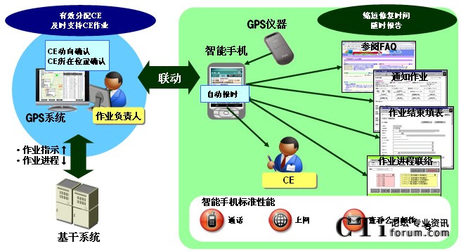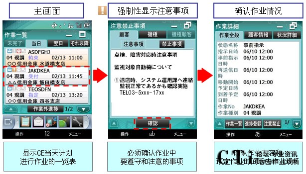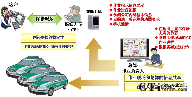 “MoBiz AP for CE支持系統(tǒng)”在加強總部和現(xiàn)場維修人員的聯(lián)動基礎(chǔ)上,通過準(zhǔn)確把握地點信息和作業(yè)進展?fàn)顩r,有效安排工作人員,從而達到提高工作人員一天的工作現(xiàn)場訪問次數(shù)。進一步說,有助于客戶SLA(注3)的遵守和客戶滿意度(CS)的提高。