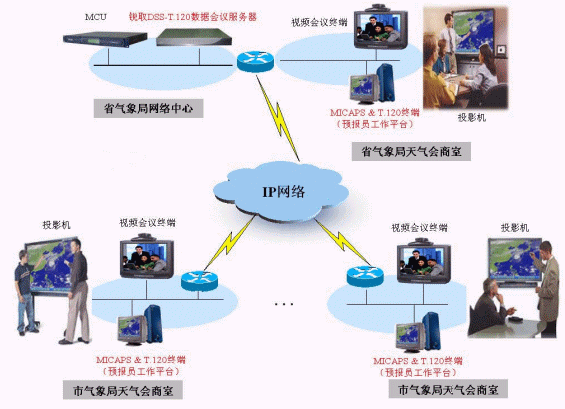 下圖為DSS-T.120數(shù)據(jù)會議服務器在某省氣象部門視頻會議系統(tǒng)中的典型應用案例。