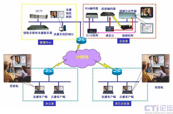 如圖所示:多媒體錄播服務(wù)器放置在管理中心,高清編碼器(采集高清視頻及聲音)及VGA編碼器(采集雙流信號(hào))放置在會(huì)議室,客戶端可以是網(wǎng)絡(luò)內(nèi)的任意一臺(tái)計(jì)算機(jī)。整個(gè)系統(tǒng)簡(jiǎn)單明了,分布靈活,部署簡(jiǎn)單,系統(tǒng)只要連接了信號(hào)線,配置了IP地址即可投入使用,無(wú)須專(zhuān)業(yè)布線。各部分配置如下: