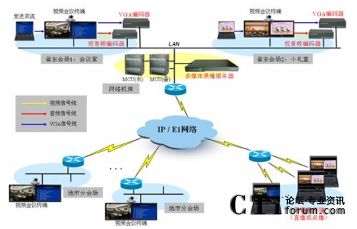 項(xiàng)目中采用了一套銳。ǚ植际剑┒嗝襟w錄播系統(tǒng),其中多媒體錄播服務(wù)器一臺(tái),部署在網(wǎng)絡(luò)機(jī)房;兩套編碼器分別部署在會(huì)議室和小禮堂,編碼器從視頻會(huì)議終端獲取視音頻及雙流信號(hào),并通過IP網(wǎng)絡(luò)發(fā)送給機(jī)房?jī)?nèi)多媒體錄播服務(wù)器,由多媒體錄播服務(wù)器實(shí)現(xiàn)視頻會(huì)議的錄制、直播和點(diǎn)播,該服務(wù)器支持2組會(huì)議并發(fā)錄播,可滿足2組并發(fā)視頻會(huì)議的錄播需要。分會(huì)場(chǎng)及不具備視頻會(huì)議終端的地方,可使用電腦登陸多媒體錄播服務(wù)器來(lái)接收會(huì)議的實(shí)時(shí)直播或在會(huì)后進(jìn)行點(diǎn)播。