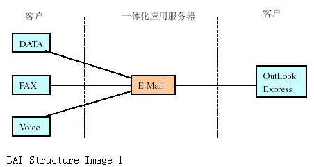 如果我們把各種信息(電話、傳真、數(shù)據(jù))在一體化應(yīng)用服務(wù)器上統(tǒng)一為E-Mail 形式在企業(yè)內(nèi)部或INTERNET 郵件系統(tǒng)轉(zhuǎn)發(fā)。實(shí)現(xiàn)起來就較簡單,如下圖所示:
