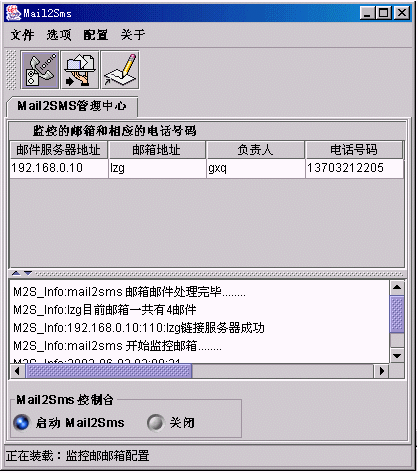 此窗口主要用來顯示Mail2SMS與所監(jiān)控郵箱的連接狀態(tài),及啟動與關(guān)閉Mail2SMS的監(jiān)控功能。如上圖所示點擊
