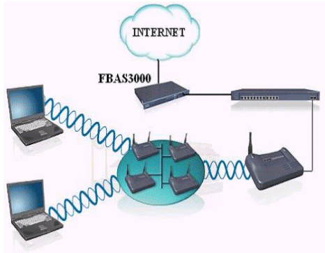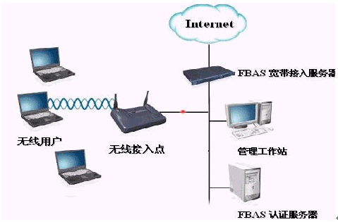 移動用戶通過自身的無線網(wǎng)卡傳遞信息到熱點接收器上,熱點接收器連接到交換機(是為了能具有更好的可拓展性),交換機連接到華夏科技FutureWorks寬帶計費系統(tǒng)的FBAS接入服務(wù)器上,通過接入服務(wù)器連接到INTERNET.這里的FBAS3000系列的寬帶接入服務(wù)器采用的是一體機的模式,接入,認(rèn)證,計費等一系列服務(wù)均安裝在FBAS里,這樣可以簡化網(wǎng)絡(luò)結(jié)構(gòu)。對FBAS的操作是通過WEB頁面來進行設(shè)置維護的,