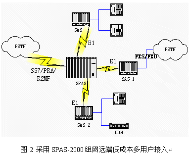 SPAS可編程交換機通過E1可以支持多個遠端模塊。遠端模塊采用SPAS-SAS框,可以帶多種用戶接口:普通模擬用戶、DDN、環(huán)路中繼用戶;通過 SPAS主模塊對外提供各種信令接入。適合多點接入組網(wǎng),且組網(wǎng)成本低。組網(wǎng)圖見圖2: