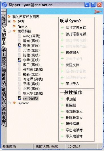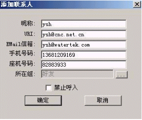 可以在這里進行所給的各項操作,選擇添加聯系人,輸入某個用戶的各項個人信息,確認后,這個用戶就會被添加到相應的組中,并且會顯示出該用戶狀態(tài)。