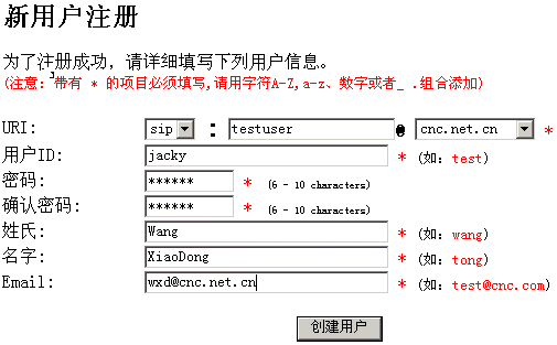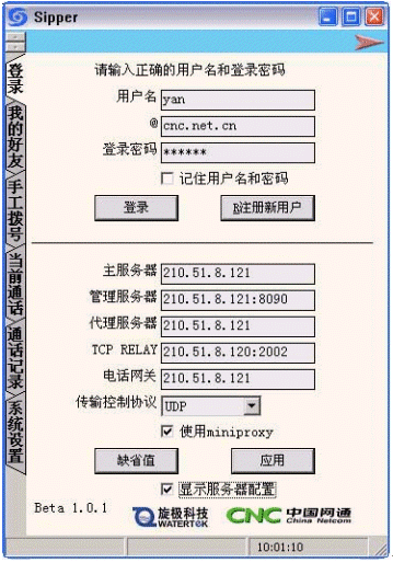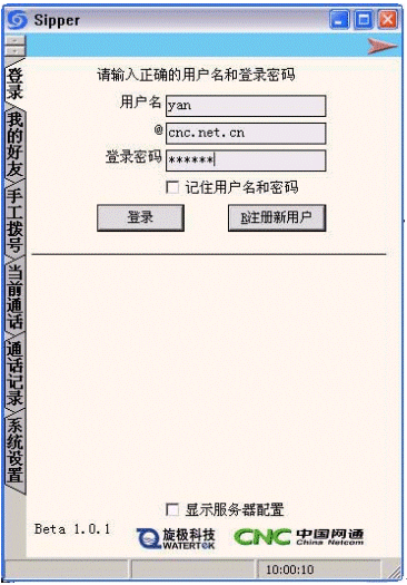 在主界面上選擇"注冊新用戶",這時會出現網通的注冊界面,選擇"開始注冊",然后將各項用戶信息填寫清楚后,創(chuàng)建用戶,成功后即可回到sipper界面登陸。