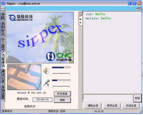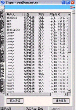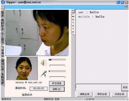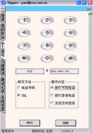 點擊后會出現對話窗口,同時在對方的機器上會出現你的呼叫請求,如果對方"接收"了你的請求,則兩個人的語音對話開始,雙方可以互相聽到聲音,沒有圖象,可以同時進行短信交流。