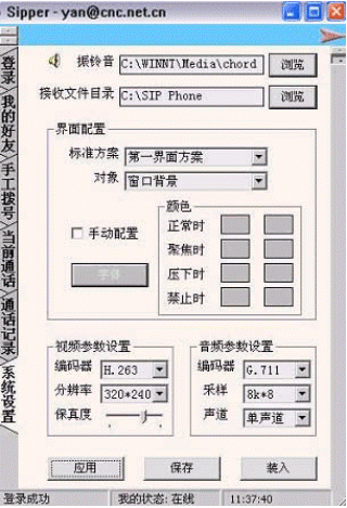 在該窗口中可以對系統(tǒng)的各項參數進行設置:振玲音、接受文件目錄、界面配色方案、大小視頻等。