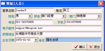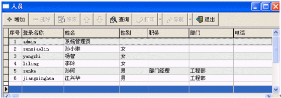 人員管理主要是對(duì)本系統(tǒng)的使用者進(jìn)行管理(增加/修改/刪除/查詢),包括使用者所在的部門(mén)、職務(wù)等