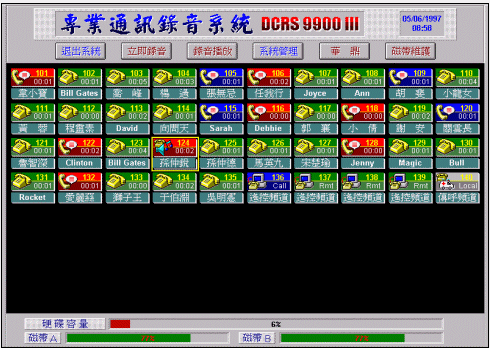 DCRS與BRS系列之全數(shù)字專業(yè)通訊簿音系統(tǒng),彩色動畫窗口,配合鼠標操作,使您一目了然,操作容易。您可由主窗口圖標中,清楚知道每一回路目前錄音狀態(tài),例如呈綠色的圖標是顯示回路是閑置狀態(tài)(沒有通話狀態(tài)),用不同顏色加上不同圖案,是最易懂、最一目了然表現(xiàn)方式。各種操作按鍵與儲存裝置(Storage Media)狀態(tài)也出現(xiàn)在很醒目位置上也是另一系統(tǒng)特色。下面文章對回路各種常見圖標有進一步說明。
