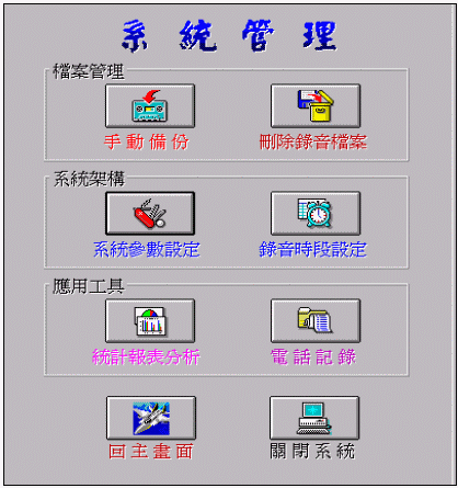 三個方塊區(qū):檔案管理區(qū)、系統(tǒng)架構(gòu)區(qū)和應用工具區(qū)。各方塊區(qū)內(nèi)有其包含之功能指令。此外,"回主畫面"的功能鍵提供您可回到主窗口畫面的功能;"關(guān)閉系統(tǒng)"功能鍵則提供您正常操作關(guān)掉此錄音系統(tǒng)的功能。您不須依賴操作手冊,也不需要別人指導,您就可以執(zhí)行一些系統(tǒng)維護設(shè)定功能。