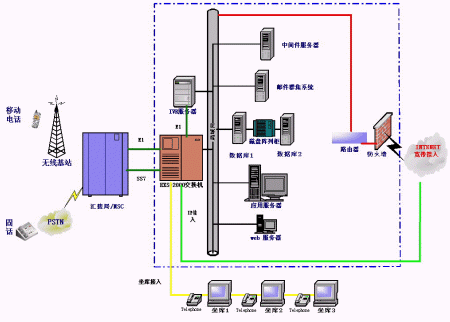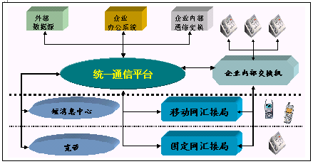統(tǒng)一通信平臺提供了與企業(yè)內(nèi)部交換機(PBX)或PSTN,寬帶或INTERNET和GSM或GPRS網(wǎng)絡的接口,融合了多種網(wǎng)絡資源和企業(yè)內(nèi)部數(shù)據(jù)源。為用戶提供了多種服務界面:WEB界面、人工服務界面,IVR界面。同時為用戶提供短信息等數(shù)據(jù)業(yè)務。