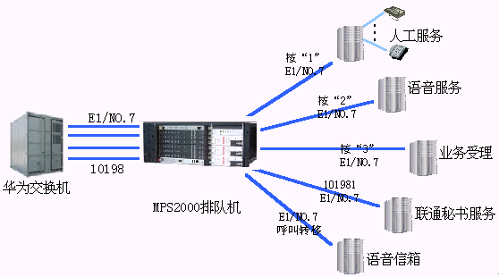 我司的排隊(duì)機(jī)通過E1與華為交換機(jī)相連,采用No.7信令。華為交換機(jī)將需要播放語音的中繼直接轉(zhuǎn)接到排隊(duì)機(jī)上,由排隊(duì)機(jī)相應(yīng)的中繼板和語音導(dǎo)航板提供語音通道和DTMF收號(hào),根據(jù)用戶的按鍵選擇轉(zhuǎn)接到相應(yīng)的語音平臺(tái)上去。這樣的系統(tǒng)很好的解決了四川聯(lián)通的需求。