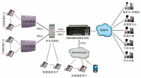 杭州繞城高速公路分成東西南北四段,此次,需要調(diào)度轉(zhuǎn)塘、下沙、半山等分處。目前,MPS2000-D指揮調(diào)度系統(tǒng)通過3個E1與華為交換機(jī)相連,基于原有通信網(wǎng)絡(luò),實現(xiàn)轉(zhuǎn)塘、下沙、半山調(diào)度用戶的接入。同時,指揮調(diào)度系統(tǒng)通過1個E1出局,實現(xiàn)外線調(diào)度用戶的接入,本次項目調(diào)度用戶共設(shè)置了120門。