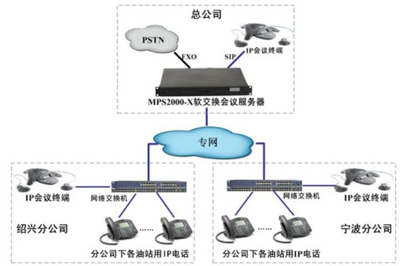 根據(jù)對方需求以及現(xiàn)有網(wǎng)絡條件,邁可行提供了MPS2000-X軟交換電話會議解決方案:MPS2000-X軟交換電話會議服務器接入中石化BP(浙江)有限公司的局域網(wǎng),通過其FXO口實現(xiàn)和PSTN的互聯(lián),以便外線人員通過公網(wǎng)電話參加會議?偛颗c各個分部各安裝一臺IP會議終端,各個加油站點安放IP話機,實現(xiàn)局域網(wǎng)內會議用戶的接入。