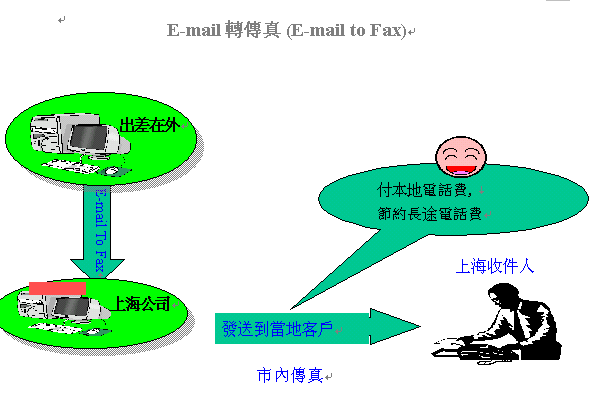 特別值得一提的是,E-mail轉(zhuǎn)傳真功能還能節(jié)省很多長(zhǎng)途電話費(fèi),如李先生出差在香港,需要將傳真發(fā)回公司所在地上海的客戶,通過(guò)E-mail將傳真發(fā)送到上海公司的伺服器,伺服器再將傳真發(fā)送到李先生上海的客戶處,如此一來(lái),國(guó)際長(zhǎng)途傳真只收市話費(fèi),何樂(lè)而不為呢?!