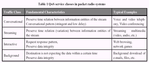 3G無線傳輸堆棧通常由二種不同類型的輸送介質(zhì)組成,專用和共享信道。然而,使用專用信道用戶可以獲得固定帶寬用于傳輸數(shù)據(jù),但使用共享信道用戶只有在動態(tài)的帶寬下傳輸數(shù)據(jù),類似于ATM或GSM GPRS。HSDPA將會成為共享信道在空中的一個擴展。除了MMS,在3G系統(tǒng)的初始階段所有的流媒體和會話應用都希望使用專用信道。 在現(xiàn)代的系統(tǒng)設(shè)計中,一個應用可以請求許多不同的服務質(zhì)量(QoS)級別的其中之一。服務質(zhì)量級別包含最大誤碼率、最大延遲和最大保證的帶寬等參數(shù)。此外,通常根據(jù)不同的應用分為不同的服務級別:會話應用、流媒體應用、交互應用以及后臺通信應用。特性和典型的例子見表1。