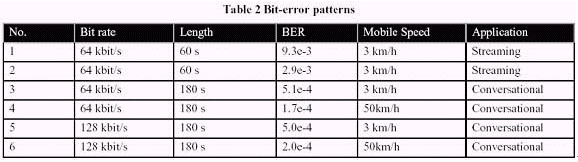 在H.264/AVC的標準化進程中,移動視頻傳輸?shù)闹匾砸呀?jīng)在3G移動傳輸里面通過對基于H.324M的電路交換會話服務、包交換會話和流服務得到了證實。這些測試情況允許適當?shù)木幋a特征、測試和容錯仿真等特征的選擇,同時也可以得到有意義的測試結(jié)果。在本文,我們將會把重心集中在基于IP的測試情況。在正常的測試情況下,我們會定義6個測試情形組合,主要測試通過3G移動網(wǎng)絡(luò)的包交換會話服務和包交換流媒體服務。另外,測試環(huán)境包括簡單的脫機3GPP/3GPP2仿真軟件、程序接口和評估標準。無線信道使用專門生產(chǎn)用于移動無線信道仿真的位率差錯模板來進行仿真。 位率差錯模板在物理層上和RLC/RLP層下來捕獲,因此,它們在實驗被用于物理層仿真。通過位率差錯模板實驗中得出的碼率、長度、位錯誤率和移動速度數(shù)據(jù)詳見下表2。