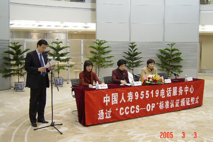 下午2點,在中國人壽保險股份有限公司總部舉行了隆重的頒證儀式。中國人壽保險股份有限公司總部及江蘇、四川、深圳分公司的95519呼叫中心順利通過CCCS標準認證。其中,中國人壽總部及江蘇省分公司95519呼叫中心獲準CCCS五星級認證評定,四川省及深圳市95519呼叫中心獲準CCCS四星級認證評定。