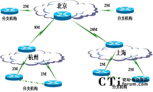網(wǎng)絡(luò)結(jié)構(gòu)為星形為主,部分節(jié)點(diǎn)為樹(shù)狀。深圳總部作為主會(huì)議中心,以星形方式連接到營(yíng)業(yè)部分會(huì)議中心,廣州地區(qū)30家營(yíng)業(yè)部通過(guò)2M線路連接到廣州中心機(jī)房,廣州中心通過(guò)64M的線路連接到深圳總部;北京15家營(yíng)業(yè)部通過(guò)4M線路連接到北京中心機(jī)房,北京中心機(jī)房通過(guò)10M線路連接到深圳總部,未來(lái)北京地區(qū)的15家營(yíng)業(yè)部也要調(diào)整為直接連接到深圳總部;深圳9家營(yíng)業(yè)部通過(guò)4M線路連接到深圳中心機(jī)房,深圳中心機(jī)房通過(guò)64M線路連接到深圳總部。