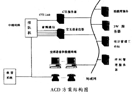 提供ACD方案的廠商傳統(tǒng)上是生產(chǎn)程控交換機的廠商。80年代以來,交換機廠家采取了以下發(fā)展策略:在增強路由能力的基礎(chǔ)上開放交換機的控制接口,以標(biāo)準(zhǔn)的軟、硬件格式提供CTI-Link,集成成熟的語音產(chǎn)品作為語音服務(wù)平臺。因此,ACD方案走的是一條基于CTI-Link標(biāo)準(zhǔn)、專業(yè)通信和計算機廠家利用各自優(yōu)勢分工合作的路。