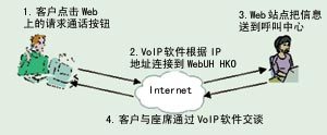 目前來講,把語音和Web在網(wǎng)絡(luò)上結(jié)合起來的理想途徑是VoIP。Web上的VoIP呼叫工作原理如圖1所示?蛻籼顚懸恍┗镜目蛻糍Y料后,點(diǎn)擊呼叫按鈕呼叫座席員。如果用戶的資料已經(jīng)在數(shù)據(jù)庫中的話,座席員就可以直接從瀏覽器上看到與該客戶相關(guān)的信息;如果用戶是第一次進(jìn)入呼叫中心,座席員的瀏覽器上就會提示向客戶詢問并記錄客戶信息。對客戶來說,只需要一臺接入Internet的多媒體電腦和免費(fèi)的客戶端軟件就可實現(xiàn)Web瀏覽和交談功能。