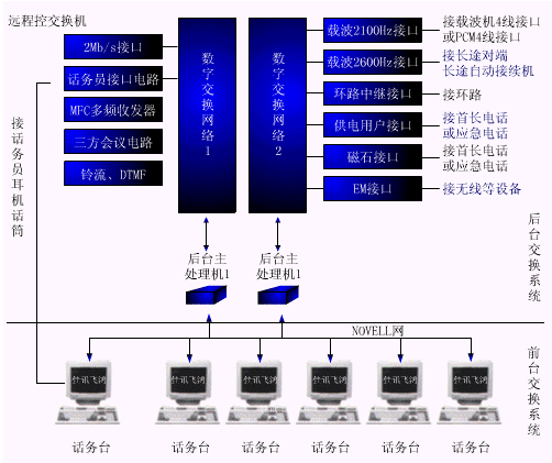 "前臺(tái)座席系統(tǒng)"包括班長(zhǎng)臺(tái)和話務(wù)臺(tái),均采用微機(jī),運(yùn)用先進(jìn)的計(jì)算機(jī)聯(lián)網(wǎng)技術(shù),將它們通過(guò)網(wǎng)絡(luò)與"后臺(tái)交換系統(tǒng)"相連。班長(zhǎng)臺(tái)和所有話務(wù)臺(tái)的硬件連接完全相同,任何一臺(tái)損壞,不影響其它話務(wù)臺(tái)的使用,即不存在關(guān)鍵接點(diǎn),提高了系統(tǒng)的安全可靠性。全漢化圖形界面,交互式人機(jī)操作方式,簡(jiǎn)單明了,易于掌握。所有話務(wù)臺(tái)均為集記錄、查號(hào)、市話轉(zhuǎn)接、長(zhǎng)話轉(zhuǎn)接為一體的綜合型人工話務(wù)臺(tái),所有功能由數(shù)據(jù)定義,可分可合,可方便的進(jìn)行設(shè)置,也可臨時(shí)并席,為系統(tǒng)高質(zhì)量的服務(wù)提供了可靠的基礎(chǔ)。所有話票均在計(jì)算機(jī)上填寫(xiě),由網(wǎng)絡(luò)自動(dòng)傳送,不再使用紙?jiān)捚,也不需人工分發(fā)話票,極大的減輕了勞動(dòng)強(qiáng)度,提高了辦事效率。為了減小系統(tǒng)規(guī)模,我們將查詢(xún)、計(jì)費(fèi)、統(tǒng)計(jì)、管理、維護(hù)五種功能融合為一體,統(tǒng)一成為多功能的班長(zhǎng)臺(tái),其功能亦可分可合,視用戶(hù)需求而定。