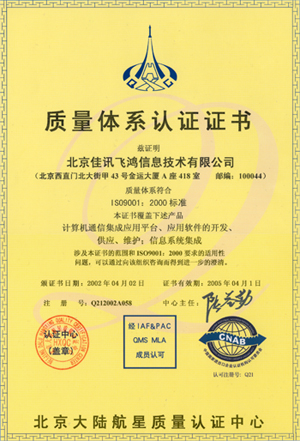經(jīng)過近半年時間的建立和保持質量體系運行,佳訊飛鴻于在2002年3月順利的通過為期三天的嚴格審核,并重點對佳訊公司核心技術的CTI平臺進行審核。2002年4月2日通過了ISO國際組織的新體系標準ISO9001:2000的體系認證,取得了通過該標準的認證證書。佳訊飛鴻公司也成為國內(nèi)第一家對CTI平臺進行審核并通過認證的公司。其完成標志著公司從成立之時起即嚴格遵循國際企業(yè)標準及現(xiàn)代企業(yè)管理模式,以軟件產(chǎn)品質量管理體系為載體,以客戶需求為導向。全面提高產(chǎn)品、服務質量,順應不斷變化的技術發(fā)展方向和市場變化,在質量、技術、成本和交期等方面全力滿足客戶需求,為客戶提供最佳性價比的產(chǎn)品和服務。