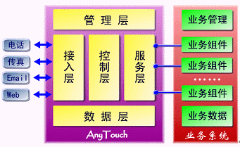 AnyTouch不僅僅是一個(gè)面向應(yīng)用開發(fā)商、系統(tǒng)集成商的CTI中間件產(chǎn)品,而且提供支持最終用戶自我維護(hù)、開發(fā)、編輯的業(yè)務(wù)接口與開發(fā)工具包;贏nyTouch,可以根據(jù)不同的行業(yè)需求開發(fā)出不同的業(yè)務(wù)應(yīng)用系統(tǒng),從而構(gòu)筑屬于自己的呼叫中心、企業(yè)增值服務(wù)、通訊服務(wù)、信息服務(wù)及CRM系統(tǒng)。