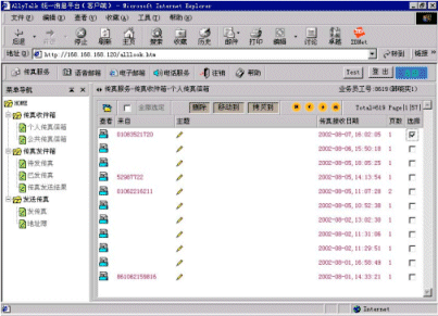 3、系統(tǒng)可以將外部的語音留言、傳真、EMAIL統(tǒng)一提交企業(yè)內(nèi)部的INTRANET服務器處理,使得職員在同一界面下完成多種任務。