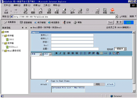 AllyTalk統(tǒng)一消息的電子郵箱具有與Microsoft Exchange或OutLook相同的功能,可以通過設定Email服務的參數(shù),實現(xiàn)公司內(nèi)部收發(fā)Email,或通過Email服務器實現(xiàn)與Internet的通信;