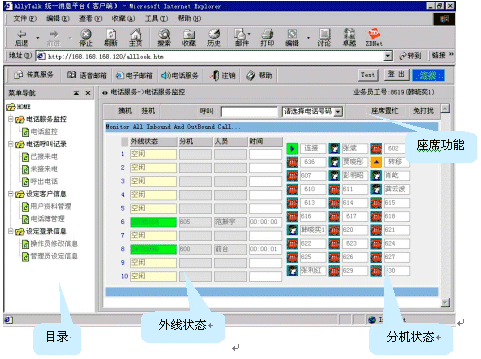 坐席輸入正確的工號、密碼后,登錄AllyTalk統(tǒng)一消息平臺,電話服務具有如下功能: