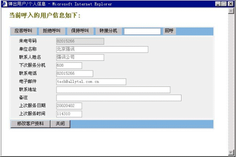 4、來電顯示:當有外線電話撥入坐席,坐席電話振鈴的同時,會在顯示器上彈出新窗口顯示來電用戶的信息;