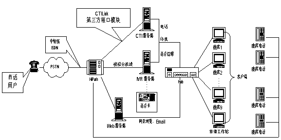 企業(yè)級統(tǒng)一消息平臺,它將交換技術、CTI技術、INTERNET技術合理地應用到系統(tǒng)中,包含了基于數(shù)據(jù)庫的智能化呼叫分配(ACD)、交互式語音應答(IVR)、傳真服務器(Fax