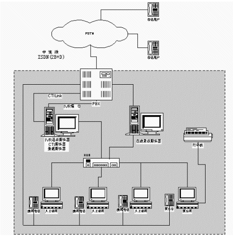 一臺Siemens Hipath交換機(jī):接入16條(2B+D)ISDN中繼線,設(shè)置人工座席分機(jī),為CTI、IVR語音服務(wù)器提供8路IVR端口。