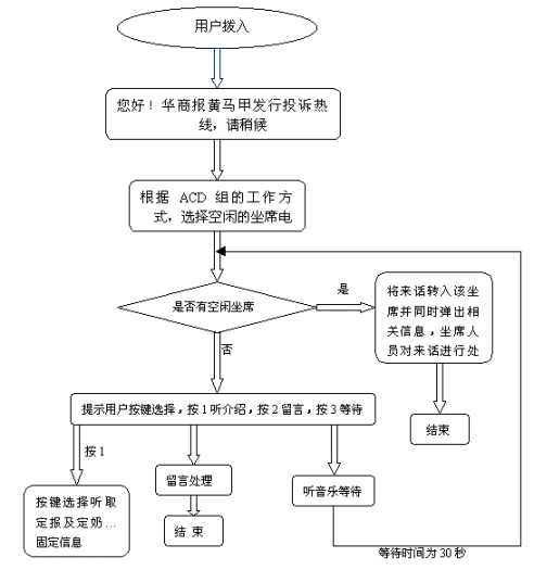 當(dāng)坐席全忙時,IVR流程會引導(dǎo)用戶按鍵選擇聽取介紹、留言及聽音樂等待,用戶可按鍵選擇聽取介紹(包括定報及定奶的信息),聽完介紹用戶可按鍵選擇繼續(xù)聽介紹或轉(zhuǎn)人工服務(wù);用戶選擇留言時,IVR流程會提示用戶留下電話及投訴內(nèi)容,有指定的坐席人員每天聽取留言并進(jìn)行處理,從而減少了由于話務(wù)量集中而坐席人員無法及時處理的投訴電話。用戶選擇等待時會聽到一段優(yōu)美的音樂,當(dāng)坐席有空閑時電話會被及時的轉(zhuǎn)入坐席由坐席人員進(jìn)行處理。