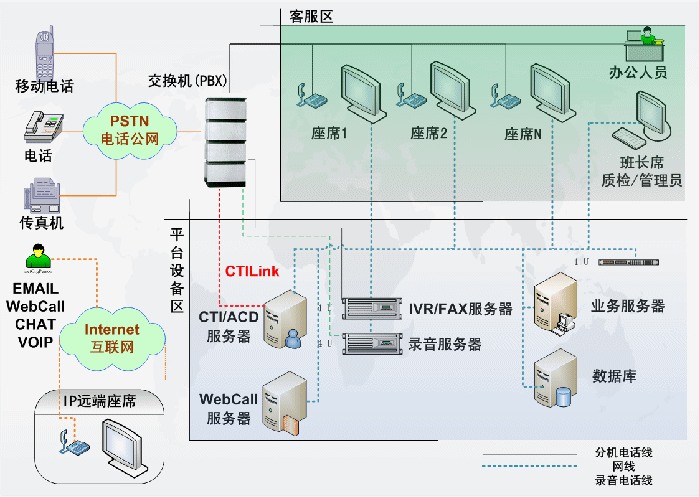 包含了PBX、CTI服務器、IVR/FAX服務器、錄音監(jiān)控 系統(tǒng)、報表統(tǒng)計系統(tǒng),CRM客戶管理等。