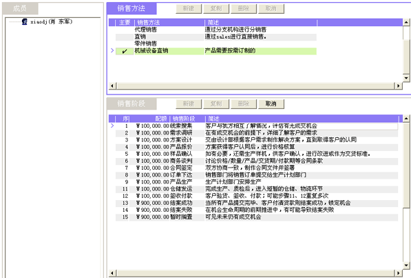 一套好的CRM軟件,應(yīng)當(dāng)同時(shí)支持多種銷售方法。例如,精密機(jī)械制造行業(yè),有可能同時(shí)需要支持四種銷售方法:標(biāo)準(zhǔn)整機(jī)銷售方法、項(xiàng)目型整機(jī)銷售方法、零件及有償服務(wù)銷售方法、三包件等。每個(gè)銷售方法都有對(duì)應(yīng)的銷售流程。以圖2為例,我們看到"機(jī)械設(shè)備直銷"的銷售方法,對(duì)應(yīng)著15個(gè)銷售階段,每個(gè)階段都可通過(guò)簡(jiǎn)述來(lái)明確該階段典型的業(yè)務(wù)特征、成交可能性的區(qū)間,以便銷售代表在操作記錄的時(shí)候擁有共識(shí)。